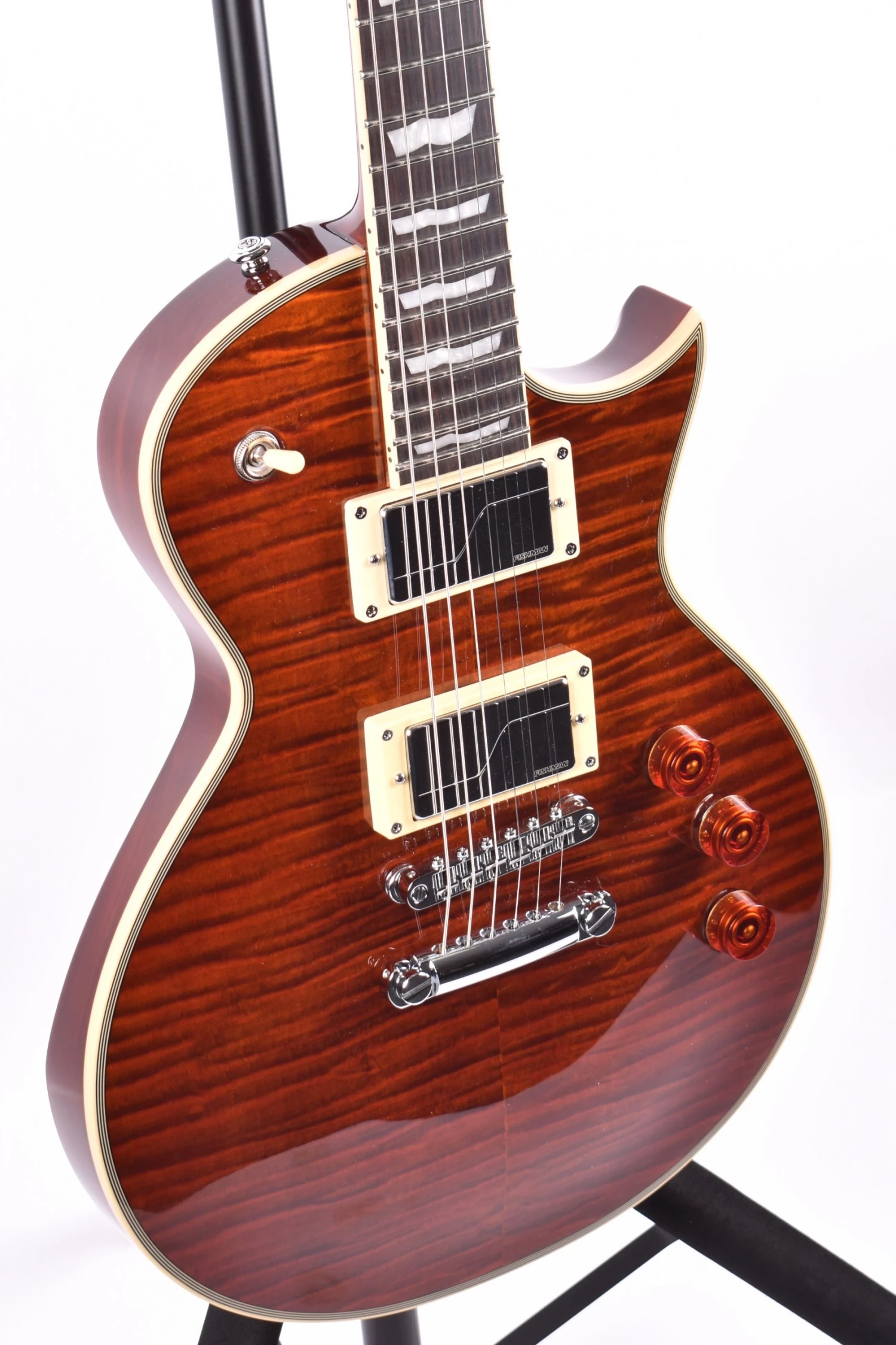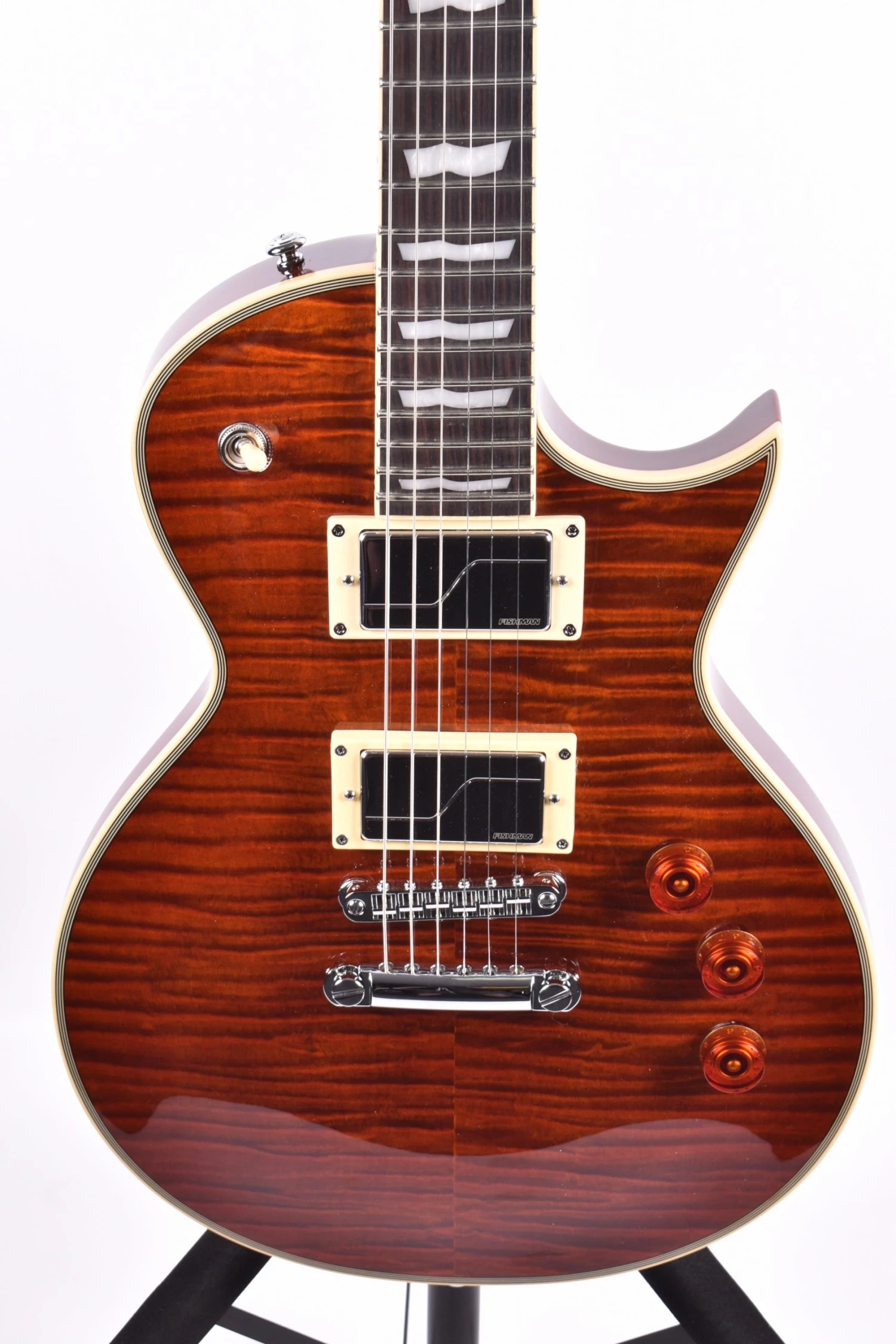 Check out this beautiful LTD Eclipse in Tiger Eye, with the amazing Fishman Fluence Modern pickups! This guitar is built for rock, with its slender body, comfortable contours, and roaring multi voice pickups!!Â