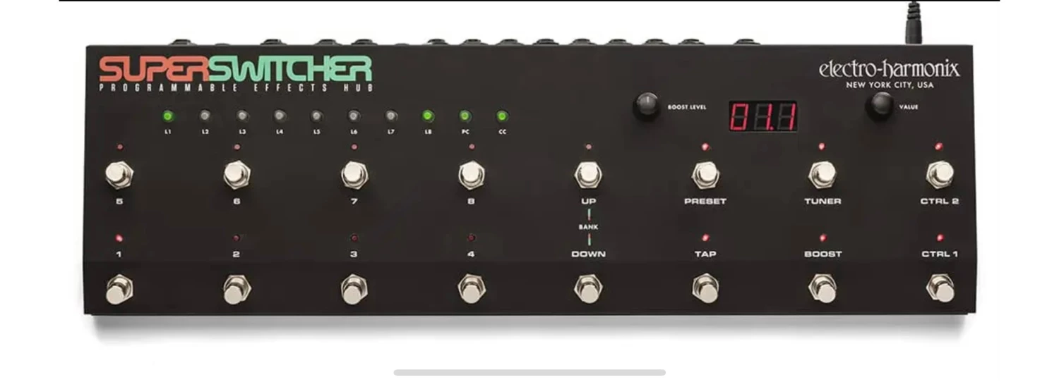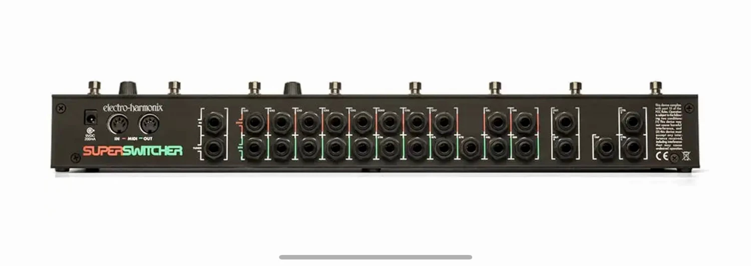 The EHX Super Switcher, as its name implies, offers a powerful solution for players who are tired of “tap dancing” around their pedalboard. In effect, it moves all of your pedals to your pedalboard’s front row while delivering control of them with one button push. The result is that it puts the player back in control of an unruly pedalboard!