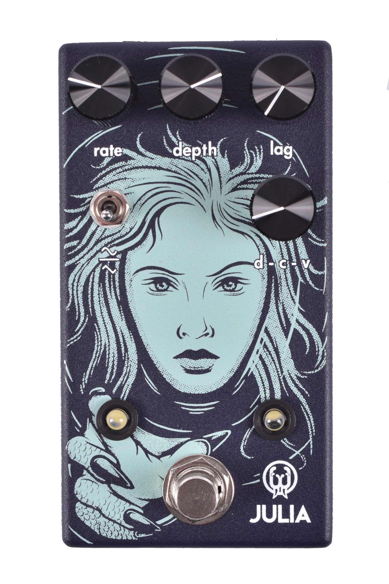 While most chorus/vibrato pedals offer a toggle to go between the two effects, we’ve provided a knob to blend between Dry, Chorus, into Vibrato (labeled d-c-v on the pedal). The Dry-Chorus-Vibrato Blend changes the ratio of dry to wet signal sent to the output. At minimum, you will hear no effect. Set it to noon for equal parts dry and wet – the traditional chorus setting. Set it to maximum for 100% wet – the traditional vibrato setting. Explore the ground between minimum and noon for adding slight amounts of movement to your dry signal (also making the Julia great on bass guitar). Explore the ground between noon and maximum for all sorts of unheard chorus/vibrato combinations.